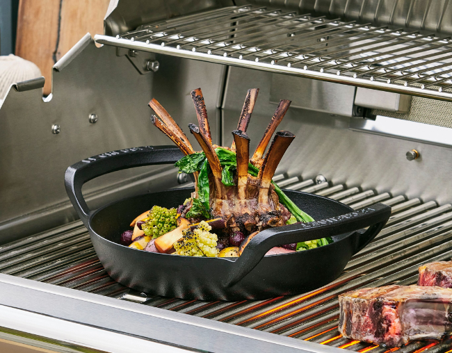 Coloca el costillar en forma de corona en el centro de tu Skillet Redondo Alpine elaborada de hierro, y acomoda las verduras alrededor.