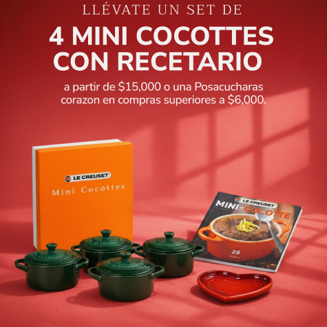 En compras iguales o mayores a $14,999 MXN, agrega a tu bolsa un Set 4 Mini Cocotte con Recetario GRATIS (modelo 843251158485 ), con valor de $3,319.00 MXN.