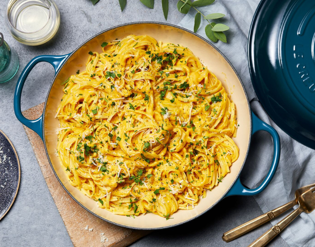 Hierve el spaghetti en un Cazo de Hierro Colado con abundante agua y una poco de sal hasta que esté al dente. Reserva ½ taza del agua de cocción antes de escurrir.
